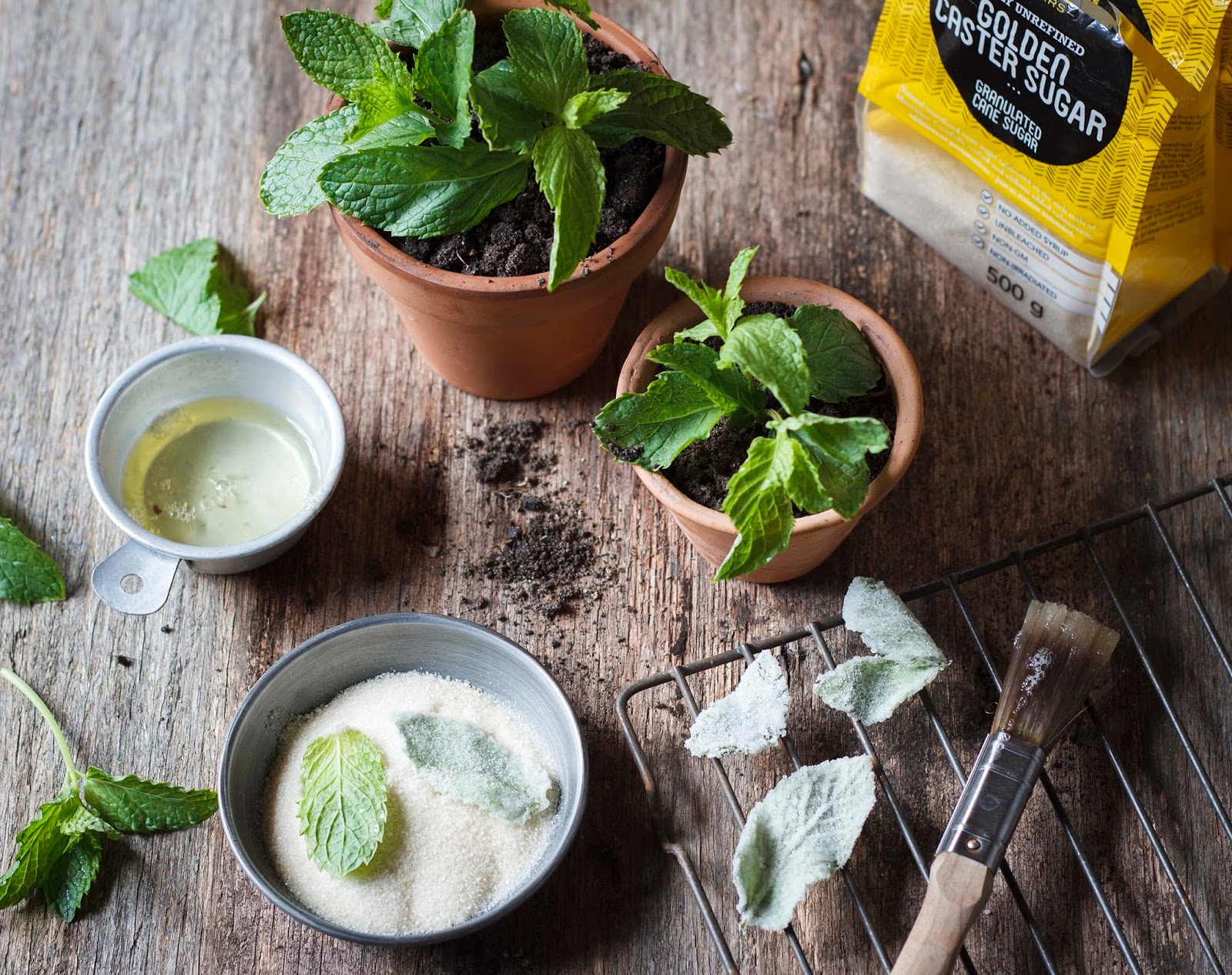 To make the frosted mint leaves, brush the leaves with a thin layer of egg white then toss in the caster sugar. Place on a cooling rack and allow to dry for 3-4 hours.