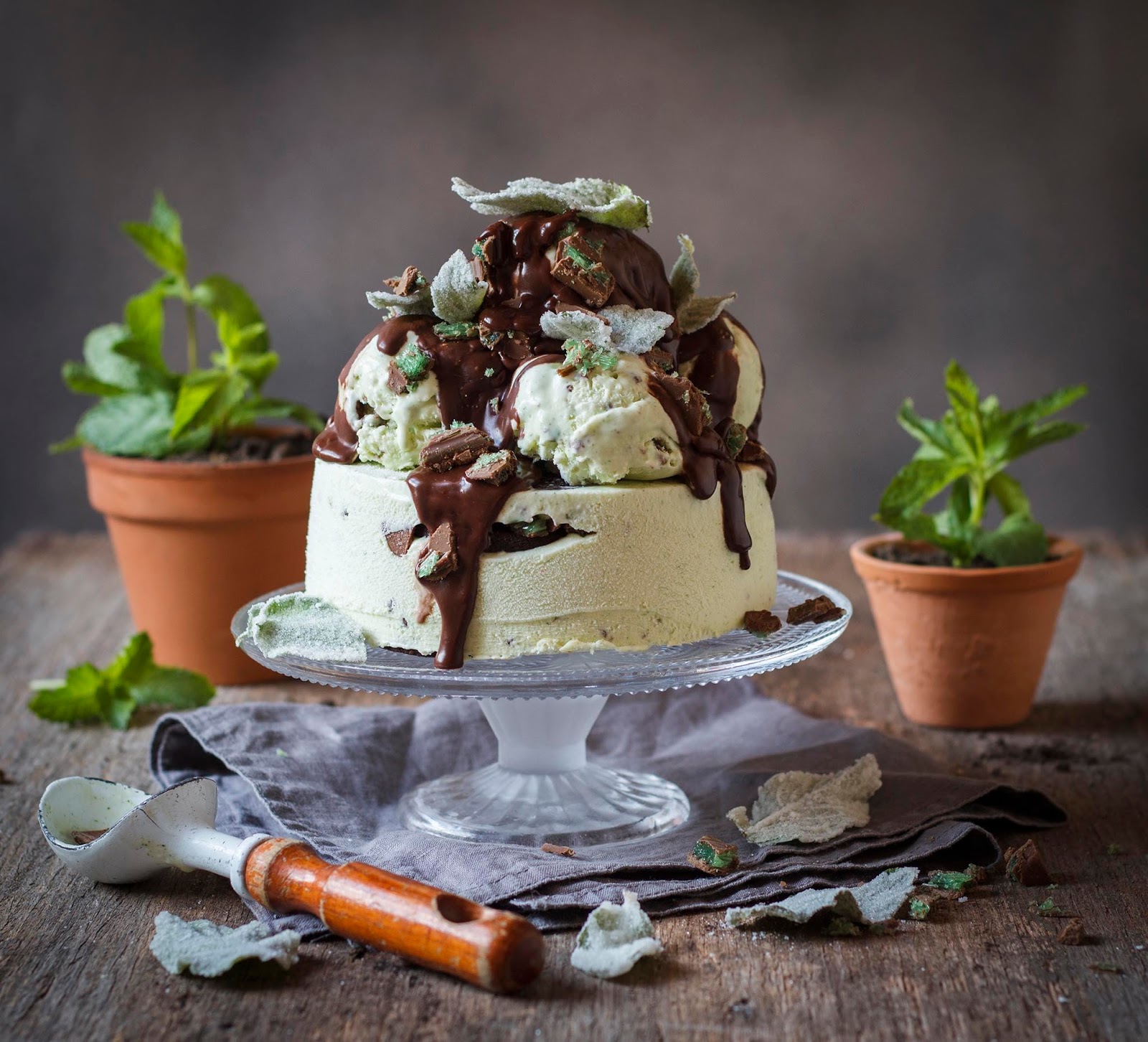 Unmould the ice cream cake by dipping briefly in room temperature tap water then loosening the bottom. Place on a cake stand then top with scoops of the leftover ice cream, drizzle with the chocolate sauce and decorate with chopped peppermint crisp and the frosted mint leaves.